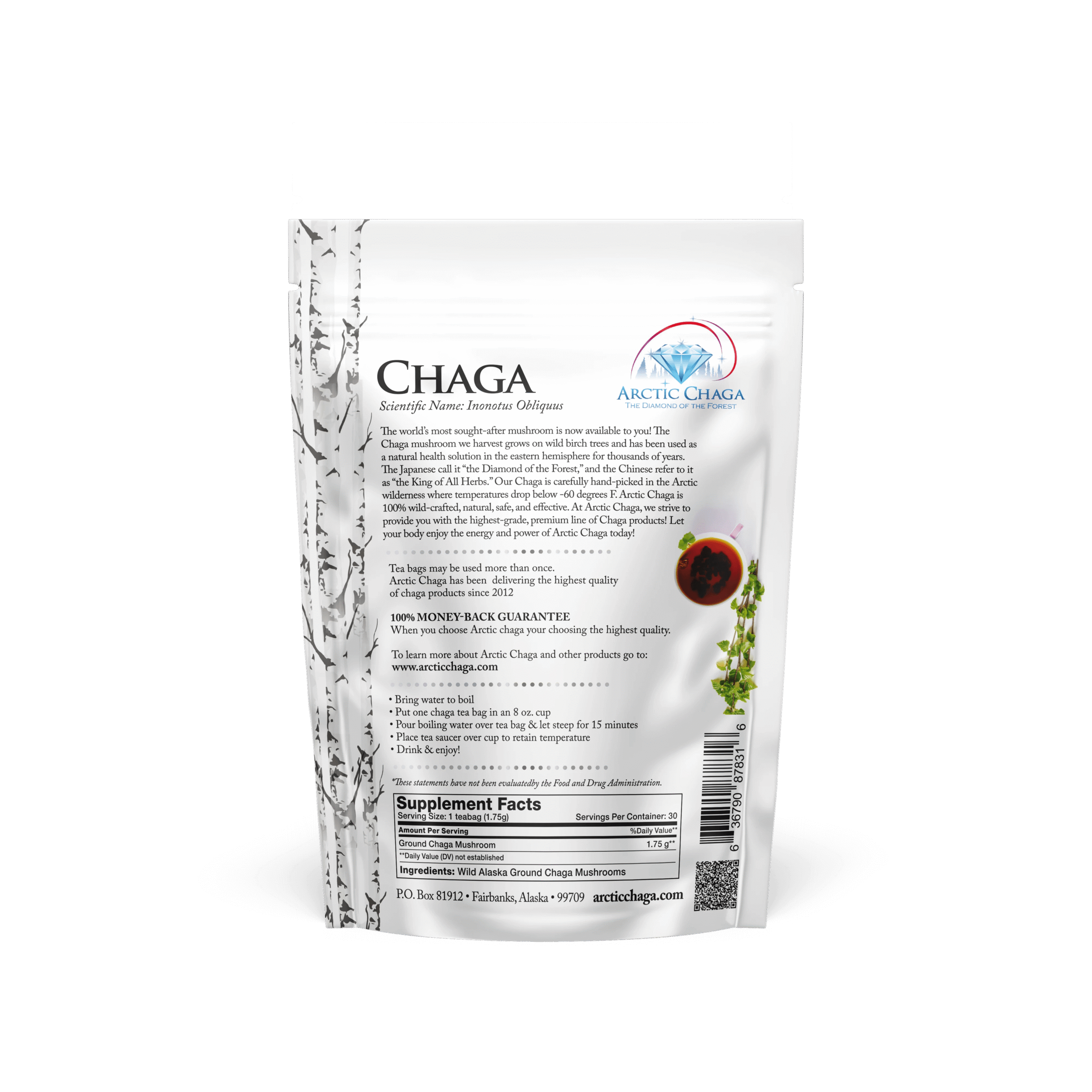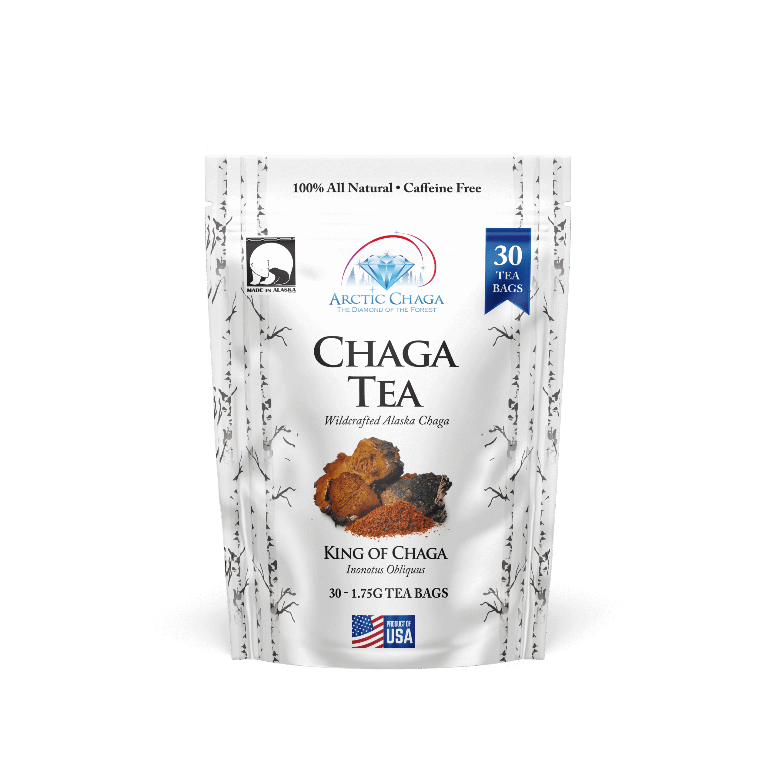 Wildcrafted Alaska Chaga in Every Cup Enjoy the pure, earthy power of wild-harvested Chaga picked from the remote birch forests of Alaska. Smooth, caffeine-free, and naturally rich in wellness-supporting compounds — this is the tea people feel. Each tea bag can be brewed 2–3 times, giving you long-lasting value and a rich daily ritual.